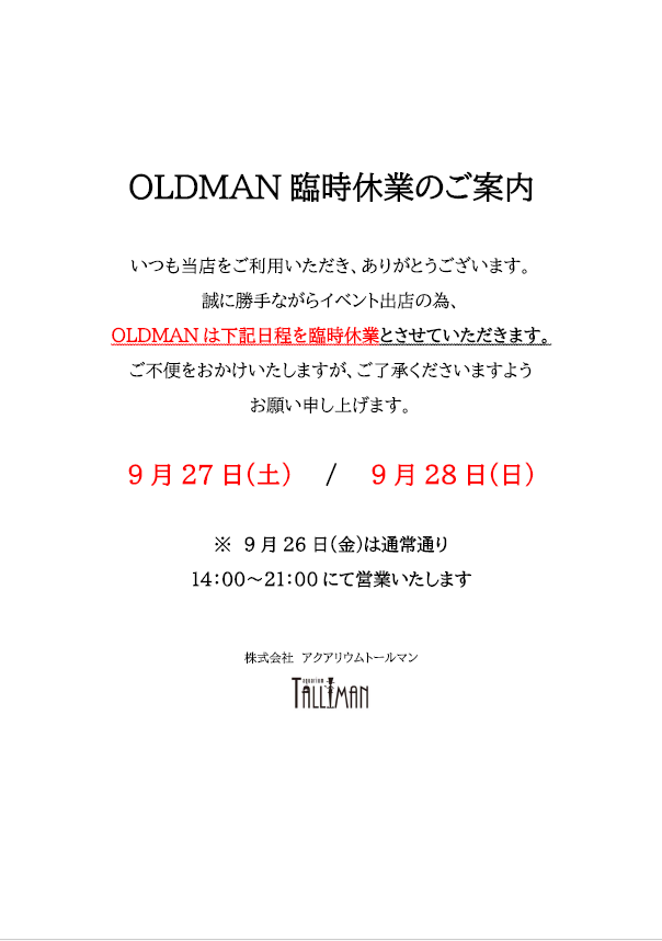 誠に勝手ながら9月27日(土)、9月28日(日)は臨時休業とさせていただきます。